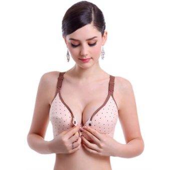 Вариант бюстгальтера для кормящих женщин светло-желтого оттенка в мелкий коричневый горошек, с открывающимися чашками.
