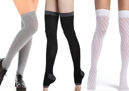 - имитация плотных гетров, которые заканчиваются чуть выше колена, и подвязок, соединяющихся между собой тонкой резинкой;