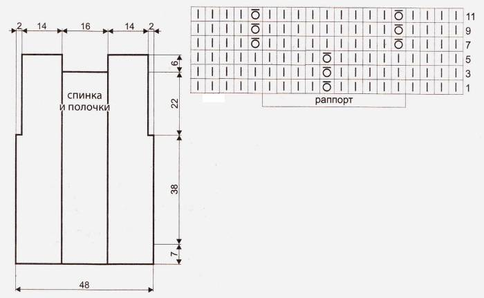 Для этого нужно набрать на спицы кромочные петли и провязать полоску 7 см. Горловину, полочки, пройму можно обвязать крючком – 2 столбика без накида.
