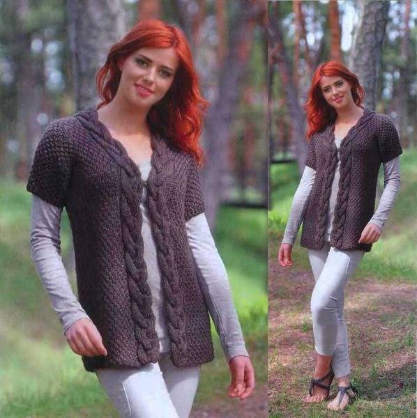 Классический вязаный жилет является универсальной вещью, которая делает любую женщину визуально стройнее. Удлиненная модель с капюшоном не согреет в прохладную погоду. Жилет с крупными пуговицами, дополненный кожаным поясом, придаст образу стильность.