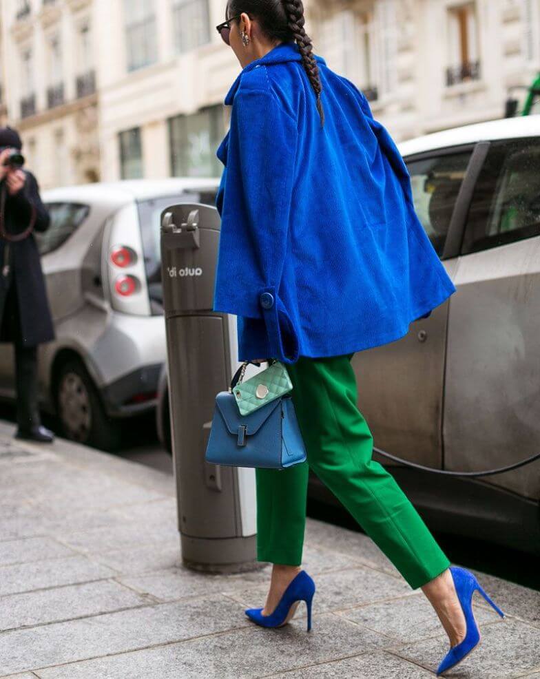 Лучше, если одна из ярких деталей комплекта возьмет на себя роль акцента. К примеру, зеленый костюм можно дополнить розовым шарфом.Носить блузу оттенка маджента вместе с юбкой или брючками оттенка молодой листвы позволительно только молодым барышням.