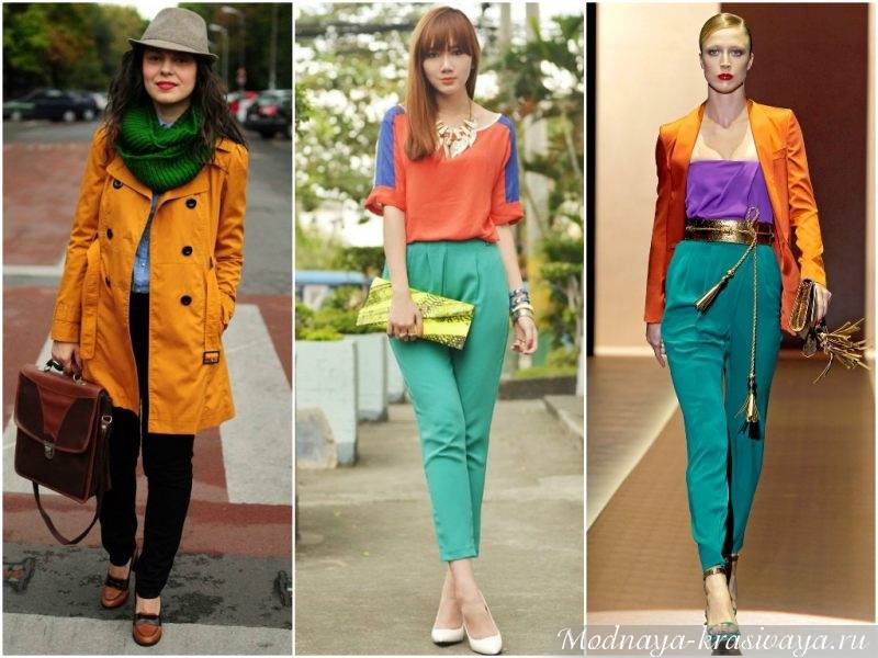 Яркие цитрусового, горчичного оттенка или виридан брюки привлекают внимание к ногам, верх подбирают белый, черный, бежевый, с рисунком. Под темно-зеленые брюки допускается надеть желтый верх, ярко-розовый
