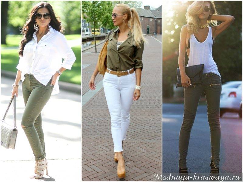 - спокойная серо-зеленая гамма придает образу стильности, благородства. Это отличный вариант для составления гардероба женщины в возрасте. Молодой моднице подобный комплект придаст вид отрешенности. Узкие брюки хаки оригинально смотрятся со светло-серым трикотажным свитшотом. Стилисты рекомендуют подбирать одежду с оттенками одинаковой теплоты;