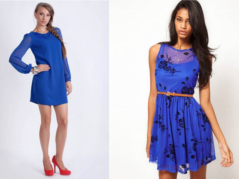 Для торжественного случая можно сшить синее шелковое платье в пол и дополнить его аксессуарами золотого оттенка. Для молодежных вечеринок лучше подойдут короткие коктейльные платья с яркими аксессуарами.