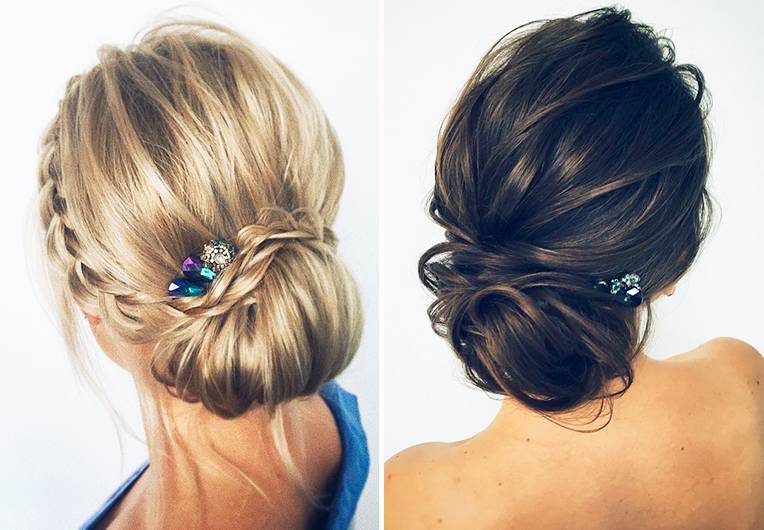 Если невеста планирует собрать волосы, то ей предстоит ознакомиться с массой интересных и модных вариантов. Можно сделать стильный низкий пучок и добавить в копну красивую брошь или заколку, как на изображениях: