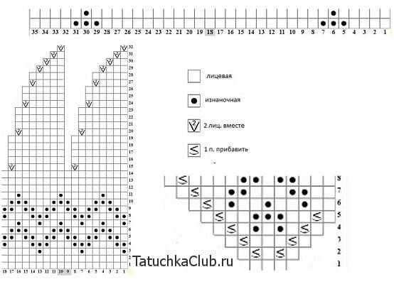 Продолжаем работу по схеме слева с 1 по 32 ряд. Когда на круговых спицах вязать станет неудобно, перейдите на чулочные.