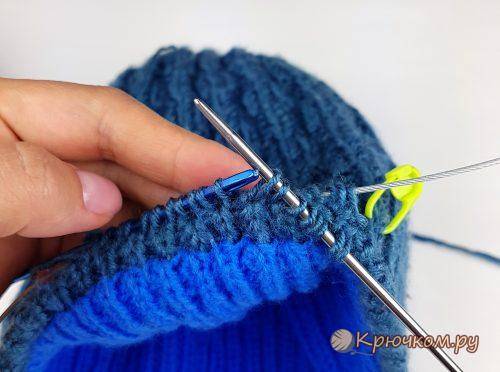 - Теперь набираем петли на второй стороне ушка, также цепляясь за полупетли и вытягивая туже рабочую нить.