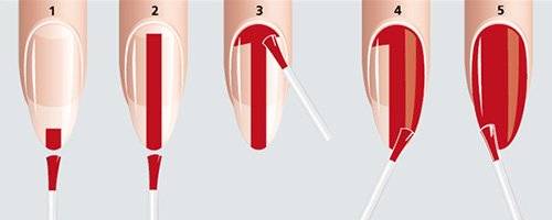 Чтобы лак на ноготь лег правильно, его нужно наносить полосками, начиная с середины ногтя, и потом с левой стороны ногтя и перейти к правой стороне ногтя, снизу вверх, не меняя направления.