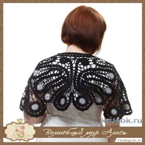 Воротник «Ажурная бабочка», работа Alise Crochet. Техника: вязание крючком Материалы: данный воротник связан Пряжа: Vita Crystal состав: 100% акрил цвет: черный — 5652, серый — 5662. Источник описания модели: модель Ольги Литвиной, журнал МОД № 446. Воротник крючком, описание Модель выполнена крючком в технике «брюггское кружево» (подвологодские вилюшки). Основой является вилюшка…