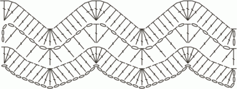 В этом, как и в предыдущем варианте зигзага, все столбики следует вязать с одним накидом. В первом вспомогательном ряду надо связать три петли подъема. Затем в первые две петли цепочки основы — по столбику, у которых должна быть одна вершина. В следующие пять петель — по одному столбику с разными вершинами. Далее начинается вязание раппорта рисунка. В восьмую петлю основы вяжут пять столбиков. В следующие пять петель — по одному столбику. Затем в пять петель основы — столбики с одной вершиной. В следующие пять — по столбику. На этом раппорт заканчивается, для завершения ряда нужно связать в оставшуюся свободной петлю основы три столбика. Этот ряд при дальнейшем вязании зигзага повторяться не будет, чередуются второй и третий.
