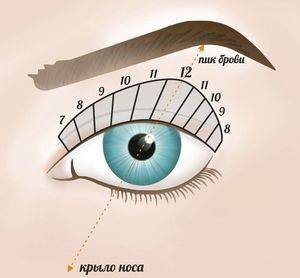 - Половина века, идущая от внутреннего уголка глаза, делится на 4 равных участка, которые равномерно заполняются волосками длиной от 6 до 10 мм.