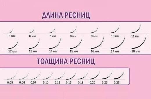 Мастер (лэшмейкер) использует волоски 3-4 длин. Длина коротких волосков – от 4 до 6 мм, длинных – от 11 до 22 мм. Толщина волокон также подбирается индивидуально. Стандартной является толщина в 0,1-0,15 мм. Если естественные ресницы тонкие, то и материал подбирается легкий, на плотные ресницы можно фиксировать крупные волокна. Для беличьего и лисьего эффекта чаще используются широкие, плотные волоски.