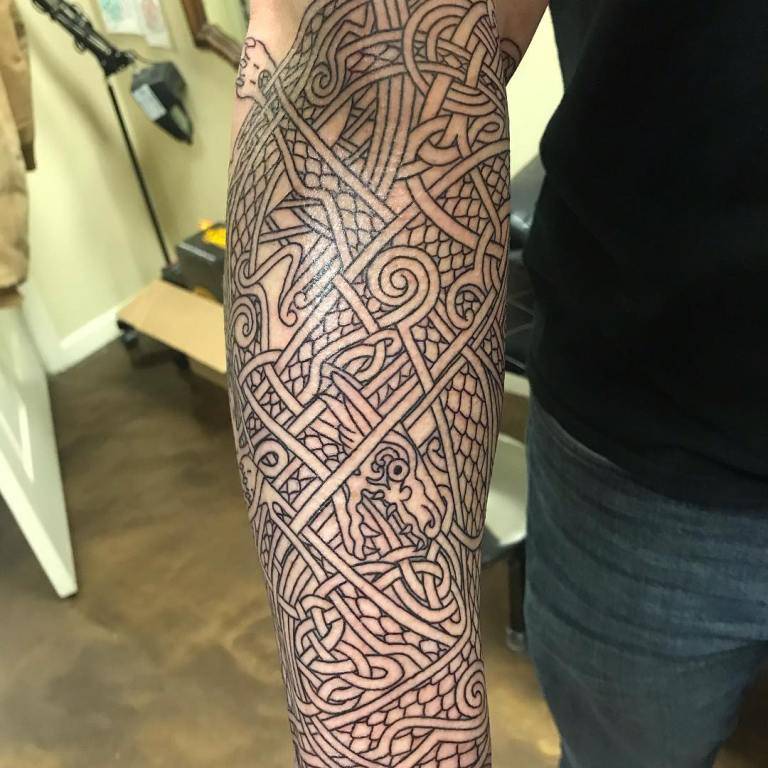 Кельтское плетение обозначает единение духа с землей. Может находится внутри рисунка или снаружи, красиво подчеркивая узор своими завитками. Чаще всего узор набивается на руку.