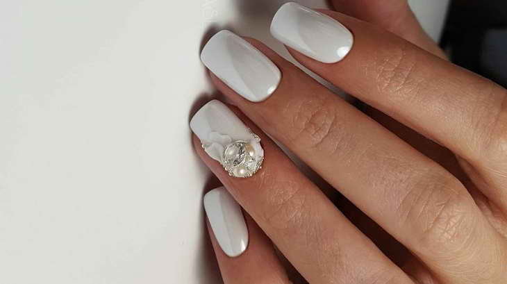 Чтобы выполнить лунный маникюр в светлых тонах, достаточно сочетать белые, нюдовые и коричневые цвета. Причем лунулу в данном случае можно подчеркивать не только качественным лаком, но и различными элементами декора.