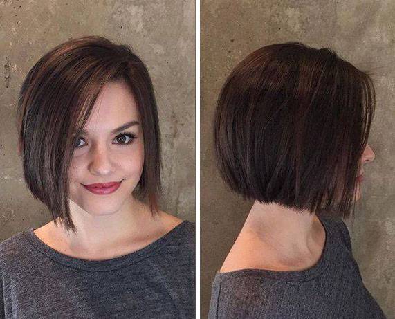 Круглолицым девушкам необходимо визуально вытянуть лицо, и в этом поможет стрижка боб. Подберите асимметричные стрижки или варианты с объемом в области затылка.