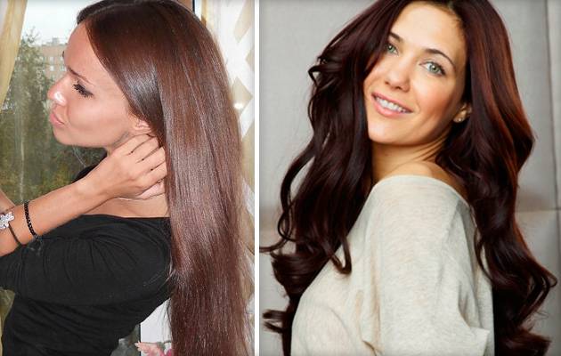 К теплым можно отнести благородный оттенок «шоколад». С его помощью можно добиться насыщенного коричневого цвета волос. Это сделать не так легко, потому что в настоящем шоколадном тоне не должно быть рыжины. Бытует мнение, что «шоколад» подходит любому цветотипу, однако это не так. Его соответствие зависит от полутонов, которые преобладают в том или ином «шоколаде». Существуют такие оттенки, как «холодный шоколад», «темный шоколад», «горький шоколад» и «молочный шоколад». Естественно, как упоминалось выше, «холодный» или «горький шоколад» больше подойдут девушкам холодного цветотипа. Представленное ниже фото наглядно показывает, как может измениться цвет волос после использования краски теплого тона.
