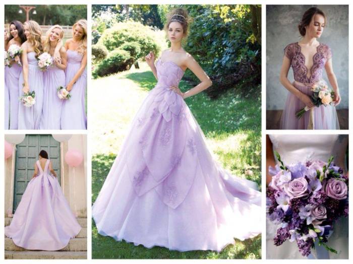 Для платьев подружек невесты нередко выбирают фиолетовый или сиреневый цвет, это видно на многих свадебных фото. Девушки в подобных коротких нарядах или длиной в пол создают яркий фон, который подчеркивает красоту невесты. Но надо тщательно продумать макияж, чтобы не выглядеть бледно.