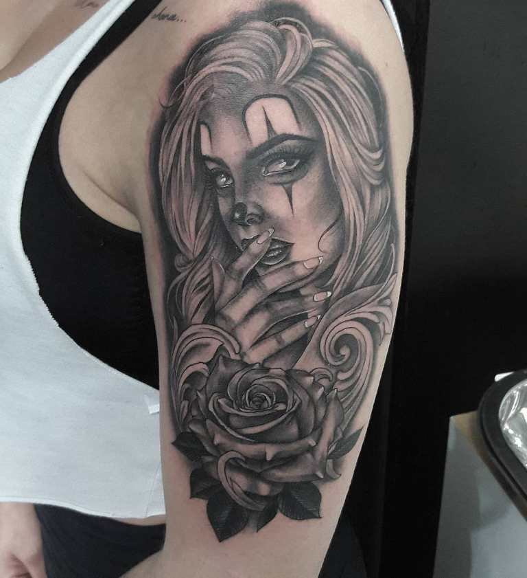 Татуировки с женским лицом в качестве мотива часто сочетаются с другими элементами, такими как голова волка или тигра, индийскими украшениями и т.д. Следовательно, значение татуировки на плече может значительно разниться. В основном, девушка на плече символизирует красоту, защиту и любовь.