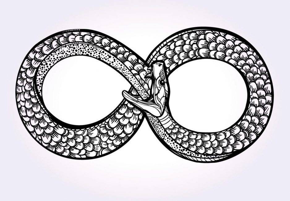Древнейшее изображение, называемое Уроборос, нашли на наскальных гравюрах в Тибете. Оно символизировало змею, глотающую собственный хвост. Мистический символ упоминается в древнейших легендах, установить место и время его возникновения не представляется возможным. Согласно легендам, змея пыталась проглотить свой хвост, но он постоянно отрастал, и процесс поедания продолжался бесконечно. Уроборос – фигура, показывающая, что за концом всегда следует новое начало. Может отражать цикличность природных явлений.