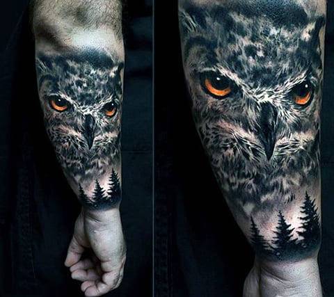 Не менее оригинально выглядит тату в стиле реализм. Такое изображение впечатляет своей реалистичностью изображения. Нередко татуировка с совой в технике реализм напоминает фото с птицей.