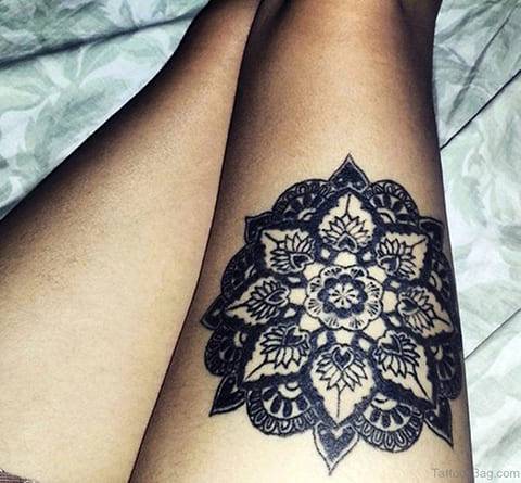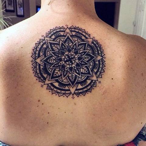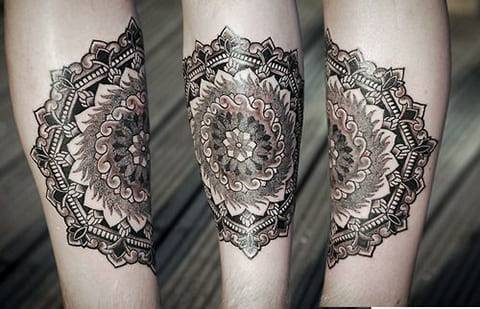 В проектах татуировки главной деталью может выступать круг или квадрат, с помещенной в него мандалой. Как правило, работа выполняется с использованием простой линейной или точечной техники, либо же смеси обоих.