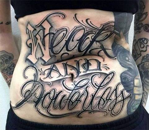 Все эти варианты – примеры открытых татуировок. Более личные надписи делают на ребрах, под грудью, на боку. Пикантную игривую надпись можно разместить в нижней части живота. Здесь же у женщин надпись часто выполняет камуфляжную функцию, являясь татуировкой на шраме после кесарева. Это отличный способ замаскировать рубец и вернуть фигуре эстетичность.