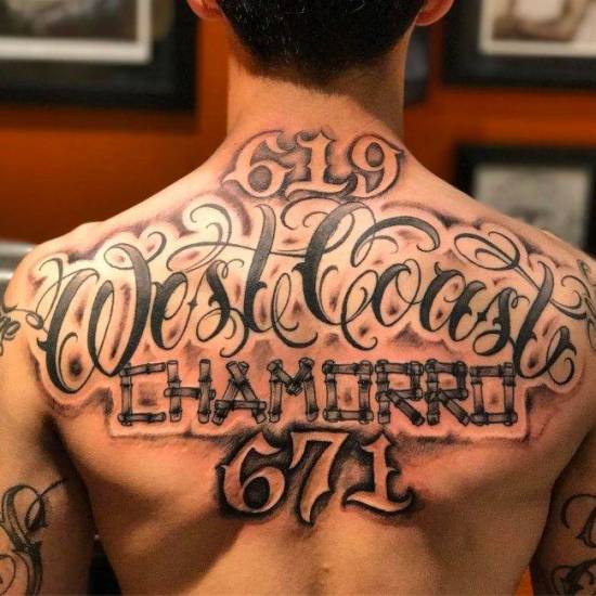 Огромное внимание в мужских татуировках надписях уделяется шрифтам, определенные фразы прописываются различными красками. Место на спине выбирается оптимальное, для мужчины чаще всего в верхней ее части