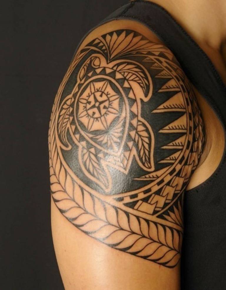 Второй распространенный элемент – это черепаха, которая играет очень важную роль в этой культуре, и считается лучшим животным, без труда ориентирующимся в океане. Татуировка на руке с изображением черепахи служит своеобразным руководством для человека, помогающим найти правильный путь в жизни. Также, мужские тату, нанесенные от плеча до локтя, символизируют упорство и счастье.