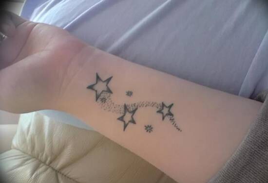 Звездочки разного размера смотрятся очень изящно. Однако это не просто украшение, ведь они имеют глубокое содержание. Пятиконечная звезда означает, что вы готовы к переменам и не боитесь их. Вариант с шестью лучами говорит о принадлежности к иудейской религии. Семиконечная звездочка символизирует гармонию между внешним и внутренним. Если вы нашли баланс между духовной и социальной жизнью, самое время набить восьмиконечную звезду.