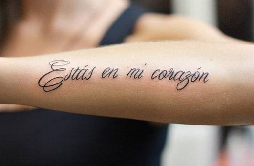 Парное тату для влюбленных в виде фразы обычно является своеобразным девизом их отношений. Слова могут быть написаны различными шрифтами на русском («Я твой недостаток» — «Ты-моя Вселенная»; «Любовь, похожая на сон»; «Мой мир – это ты»), английском, латинском и других иностранных языках.