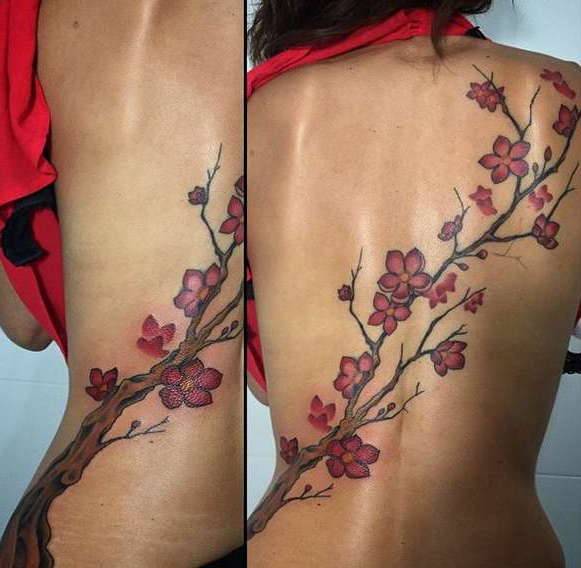 Цвет сакуры – это частый сюжет в японской живописи, который также вдохновляет и девушек. Нежный розовый цвет символизирует невинность, женские качества и привлекательность. Чаще всего татуировку изображают в виде ветки вишни, но иногда прибегают к изображению единичного цветка. Цветные эскизы с изображением этого цветка выполняют с использованием пурпурного, белого, розового и голубого цветов.