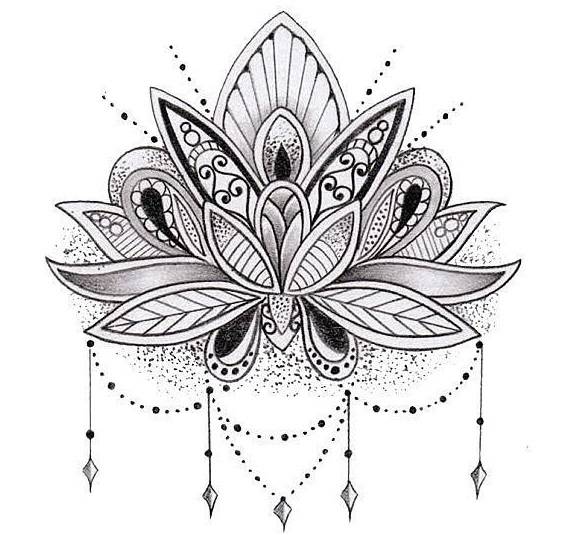 Большую популярность имеют татуировки с узором лотоса в индийском стиле. Их эскизы напоминают мандалы, могут быть однотонными или раскрашенными. Такие тату украшают нитками бусин и узорами.