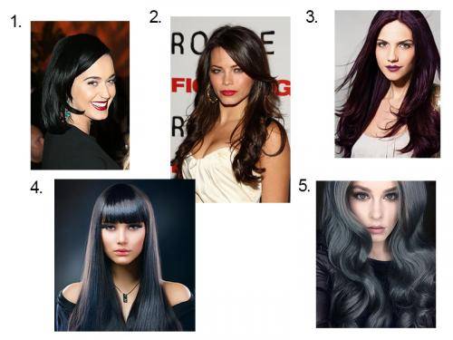Популярный ранее оттенок «воронье крыло» сейчас сдаёт позиции из-за своей однотонности и скучности. Поэтому натуральным брюнеткам рекомендуется разнообразить причёску. Тёмные цвета волос отлично сочетаются с синими кончиками. Также можно сделать мелирование (осветлить некоторые прядки) или омбре (переход от тёмного цвета к светлому).
