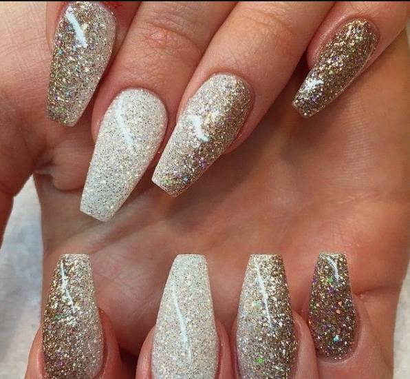 - Приятно смотрится сочетание блесток с различными цветами. Методика заключается в том, что на ноготь наносится любой оттенок, затем другим цветом рисуется полукруг или геометрическая фигура, которая дополняется блестками. Мерцающие частицы лучше всего располагать у краев ногтевой платины. Самым классическим сочетанием считается бесцветный или светло-розовый фон с белым френчем и блестками.
