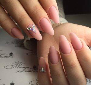 нежно, если подчеркнуть мягкость очертаний с помощью френча или лунного маникюра. Выгодно смотрится и матовость, которая прекрасно сочетается с «бархатным эффектом», ведь можно создать комбинированный вариант: несколько матовых ногтей + покрытие «бархатом». Рисунки и штампы, блестки и стразы, втирка и фольга, камни – для миндальных ногтей подходит все, не зря эту форму считают универсальной.