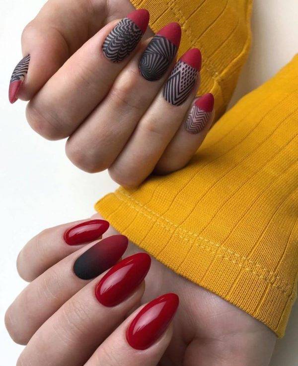Довольно агрессивное, но очень модное решение французского маникюра предлагают в нынешнем сезоне nail мастера – красный френч на миндалевидных ногтях. Такое сочетание в его естественном прочтении, где линия «улыбки» покоится на кончике ногтя, смотрится довольно вызывающе. Если вам не подходит такой вариант, то присмотритесь к идее красного френча, выполненного в технике омбре. Кстати, совсем не обязательно брать ярко-алый оттенок, можно выбрать цвета из данной палитры и поспокойнее