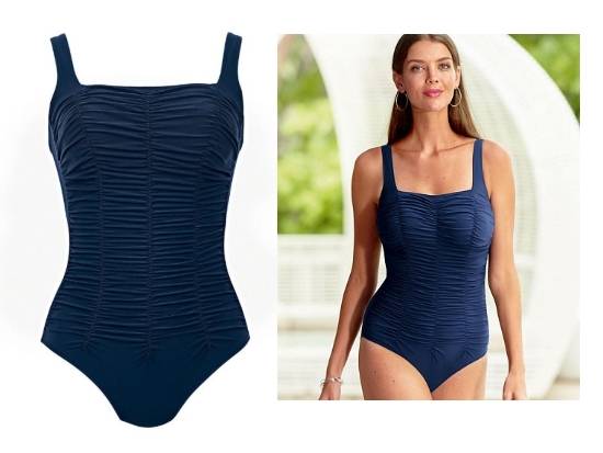 Скрыть дефект помогают купальники с драпировкой в зоне талии. Элемент декора украшает костюм и гармонизирует силуэт