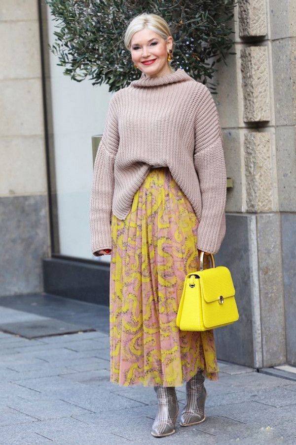 Тенденция на оверсайз коснулась и возрастной моды. Женщины, знающие толк в трендах, сегодня делают выбор в пользу стильного свободного свитера и забывают про куцые трикотажные кофту в обтяжку. Единственное условие для гармоничного образа – подходящая расцветка и сочетание оверсайз свитера с более облегающим низом.
