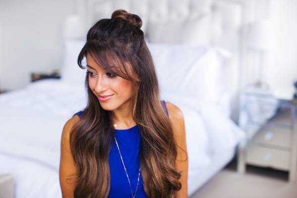 Еще один интересный образ можно создать, собрав в пучок только небольшую часть волос (он и получится небольшой, аккуратный), а остальные пряди разложить по плечам, слегка подкрутив их и добившись красивой волны, либо, наоборот, выпрямив их утюжком.