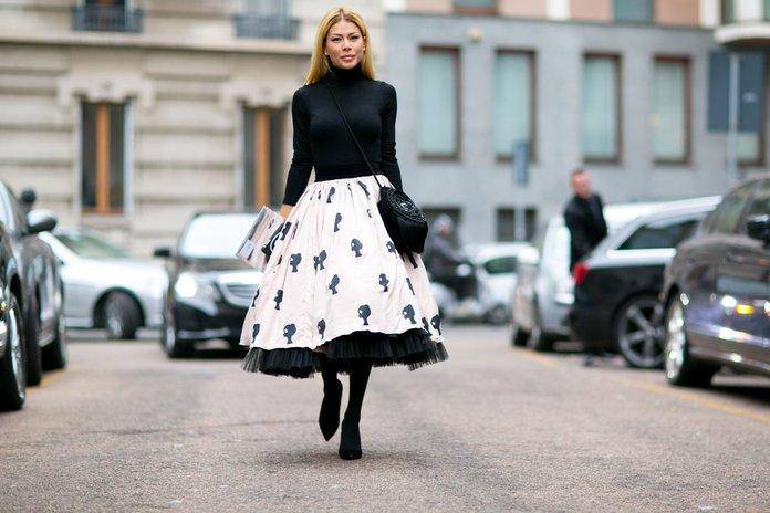 Белая юбка-колокол – это лёгкий, поистине летний образ. В сочетании с хорошим загаром и аксессуарами выглядит потрясающе. Белый низ смело сочетайте с белым верхом, главное, чтобы ткань различалась по фактуре. Для создания нежного образа к белой юбке подберите кремовый оттенок: пепельно-розовый, кремово-бежевый, кофе с молоком. Так же подойдут джинсовые сине-голубые оттенки. Черно-белый стиль – классика модного жанра. Черный топ и белая юбка задают контраста. Черный на фоне белого становится глубже и насыщеннее. Белый на фоне черного становится сияющим и ослепительным.