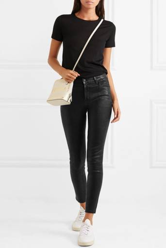 Отличным решением будет сочетание брюк из кожи и кроссовок. Если штаны черные, синие или серые обувь может быть яркой, украшенной элементами декора, например, вставками из кожи рептилий.