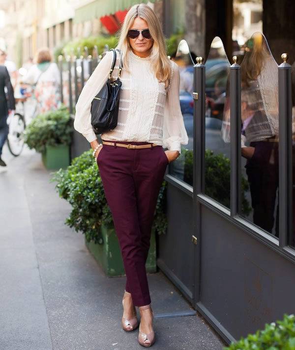в рамках одного цвета – верх и обувь подобрать на пару тонов светлее брюк. Например, модницы сочетают бордовый низ с розовыми или сиреневыми блузками. Главное – чтоб оттенок верха был более мягким и не перетягивал на себя акцент лука;