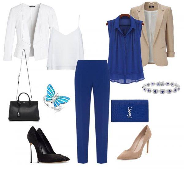 Все оттенки синего с белыми брюками создают легкий и утонченный силуэт, с использованием жакетов, кардиганов.