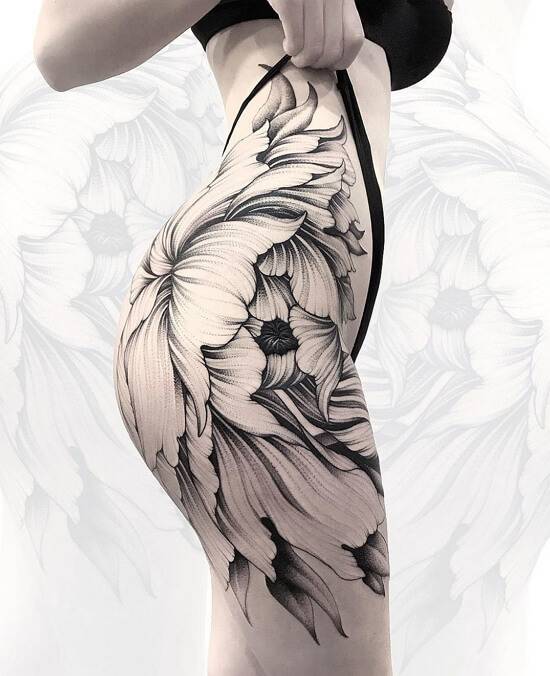 Флористические мотивы в набедренных тату фактически служат продолжением стройного стана, женской красоты, природных данных.